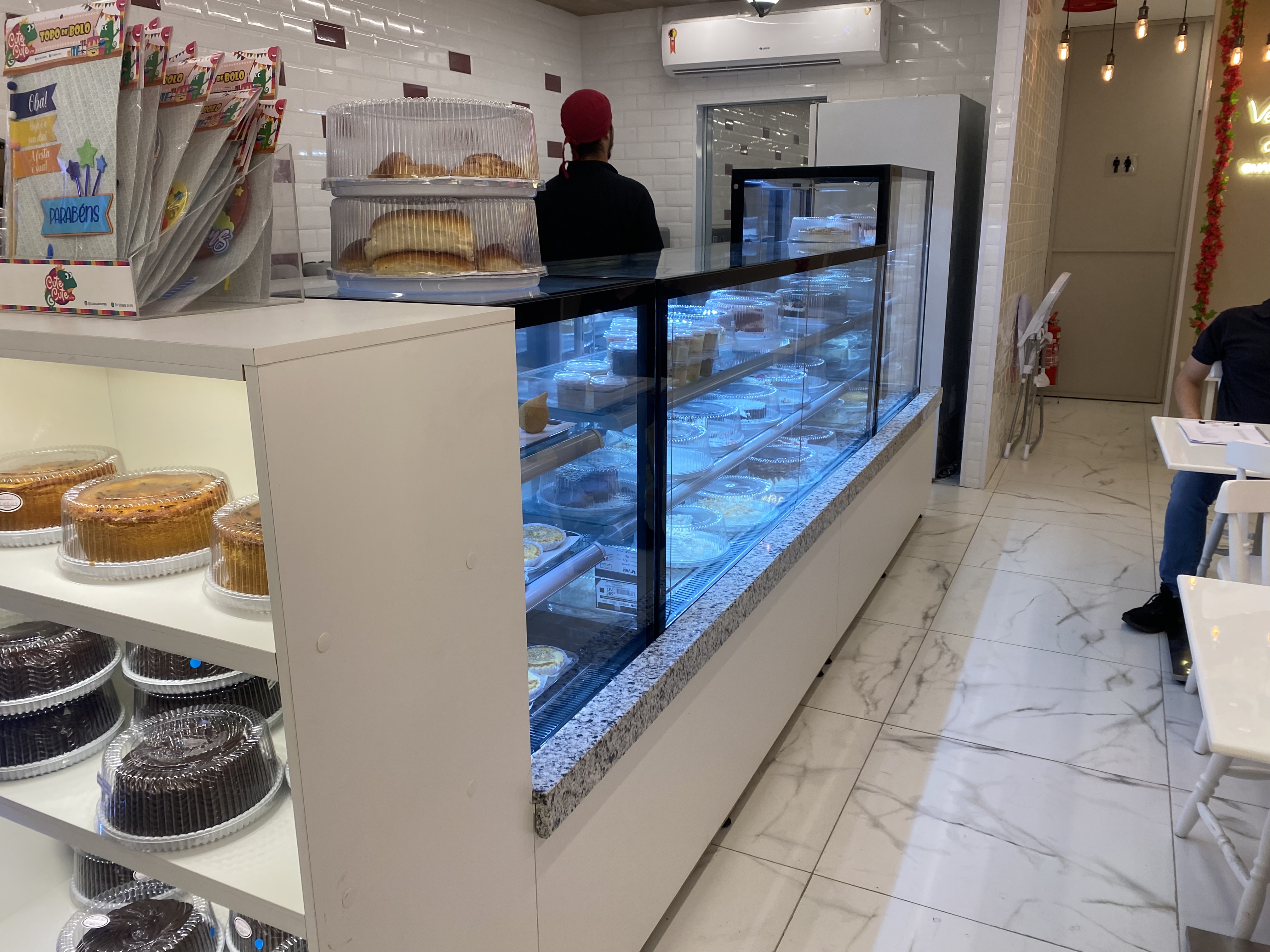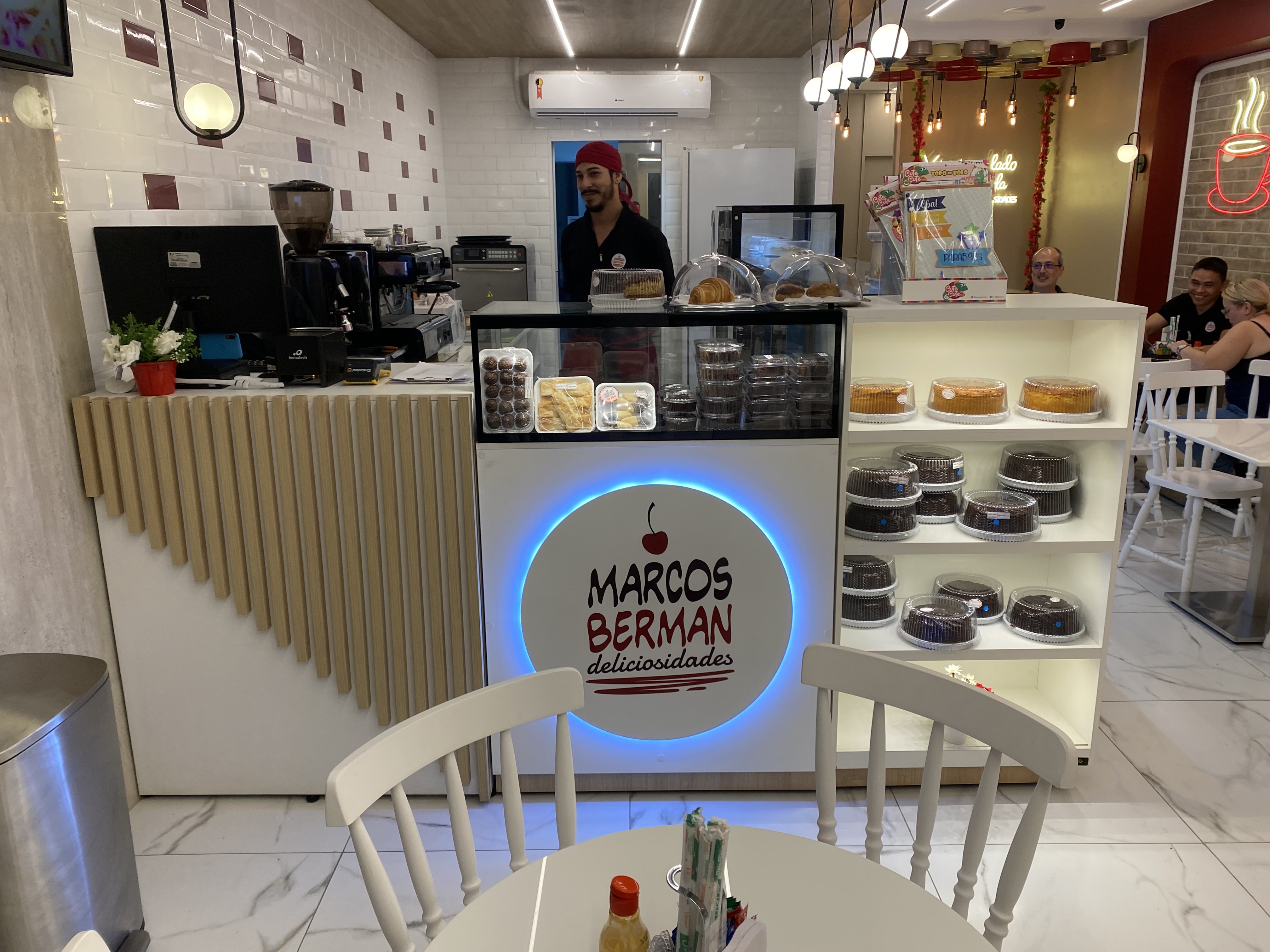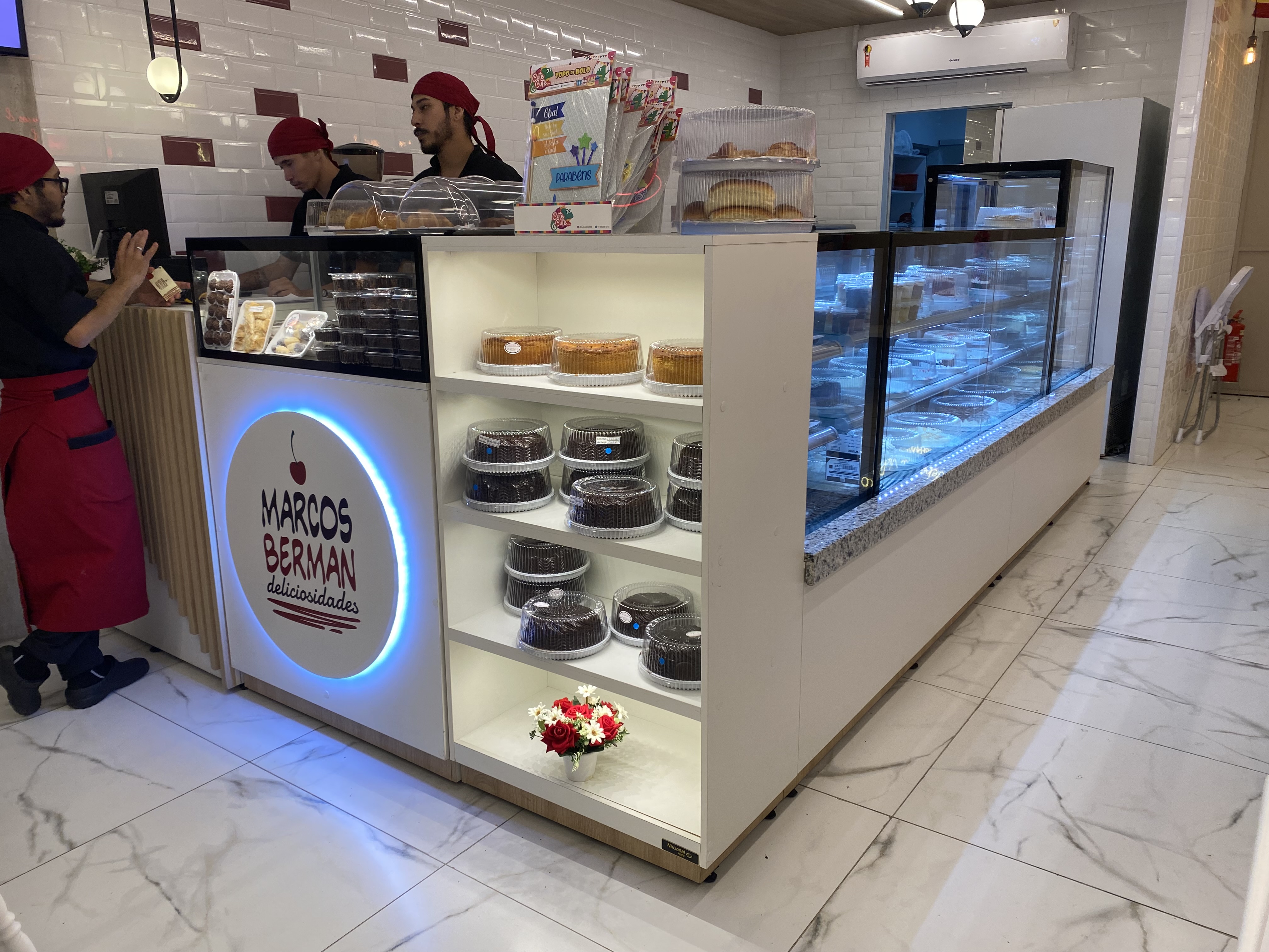 Marcos Bermann Deliciosidades - Doceria/Padaria - Ajudamos a transformar um pequeno e aconchegante espaço que pudesse acomodar os clientes para uma nova experiência em degustar estas deliciosidades, tanto doces como salgados. Utilizamos nossa Vitrine Vision com leds no teto e prateleiras, vidros temperados e laterais panorâmicas para uma melhor visualização dos produtos expostos. Este projeto é cheio de charme e aconchego.